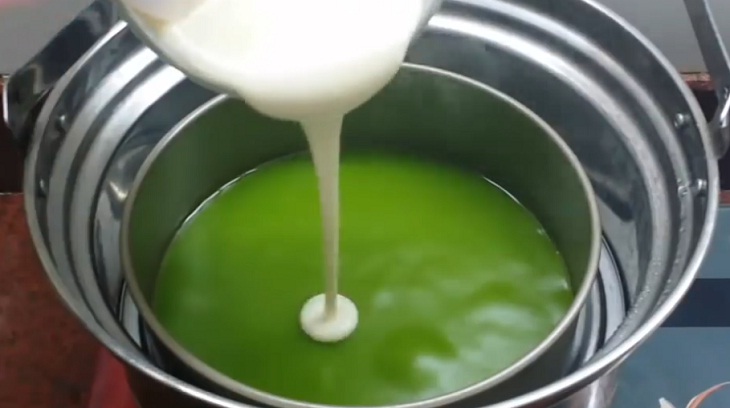 Phần bột xanh: Cho hỗn hợp 100ml lá dứa 100ml nước cốt dừa 300ml nước lọc vào rồi khuấy đều.