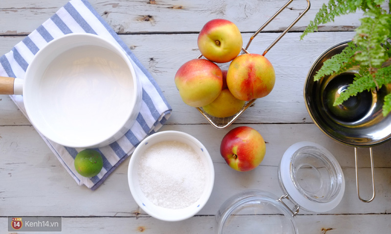 – Giờ chúng ta sẽ đun nước đường để ngâm đào. Các bạn chú ý đun ở lửa nhỏ và đun sôi khoảng 15′ đến khi nước đường hơi cô lại là được. Tỷ lệ là 1 đường : 2 nước.