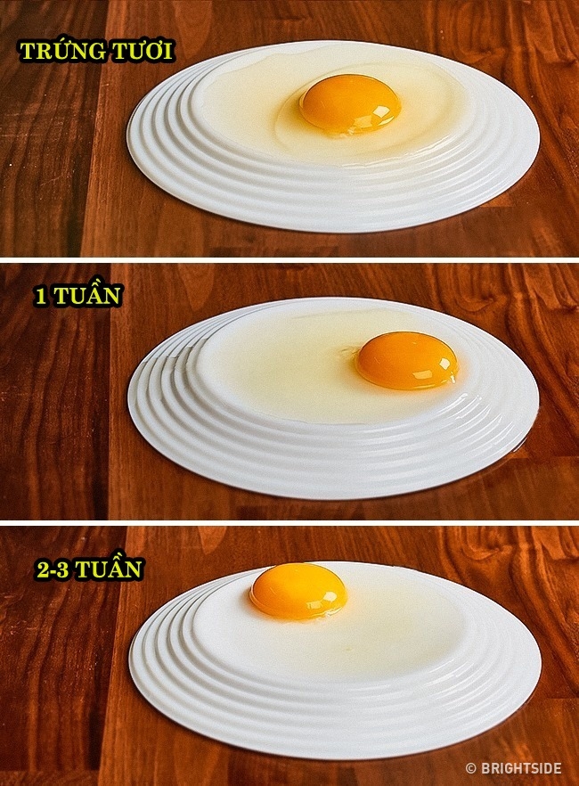 Để kiểm tra xem trứng có thật tươi hay không, cách đơn giản nhất là bạn cần chú ý đến màu sắc lòng đỏ và độ kết dính của lòng trắng như trong hình.