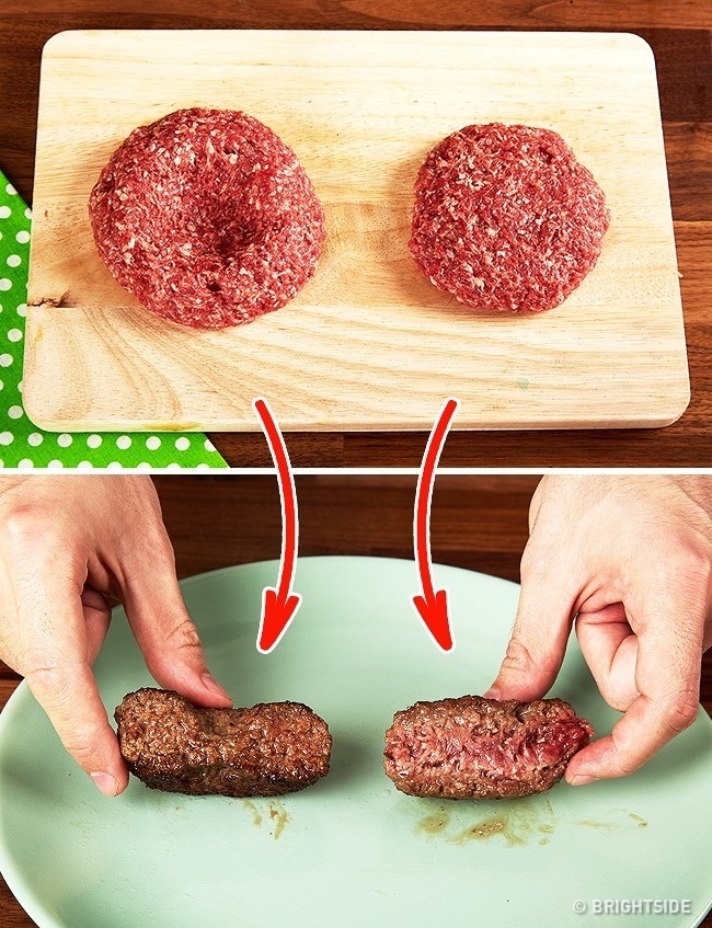 Nếu bạn chiên nhân thịt cho bánh burger, hãy nhấn một chút vào giữa miếng nhân. Các này sẽ làm giảm thời gian nấu nướng nhưng vẫn không ảnh hưởng đến chất lượng chiếc bánh burger của bạn.