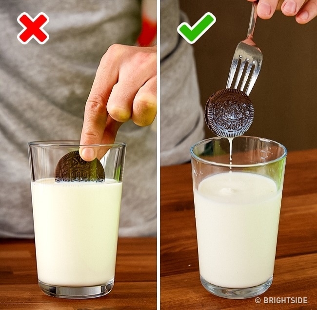 Để nhúng một chiếc cookie ngập toàn bộ vào sữa và không để cho các ngón tay của mình bị bẩn, đơn giản là bạn hãy dùng một cái nĩa.