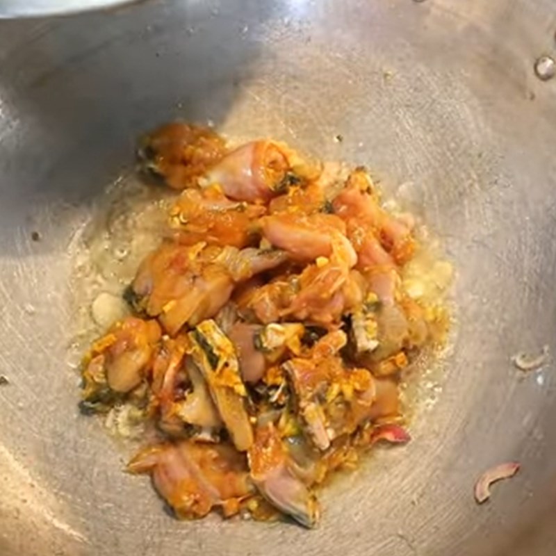 Xào ếch khoảng 5 – 8 phút, khi thịt ếch đã săn và chín tới thì cho cà đã cắt múi cau vào xào cùng.