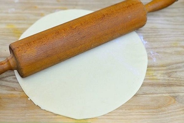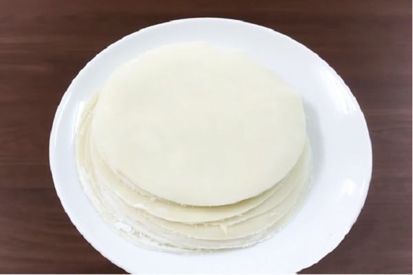 Bước 6: Dùng cây cán bột cán mỏng từng viên bột, cán mỏng sao cho độ dày miếng bột chỉ khoảng 1-2mm. Lấy bột ngô rắc đều lên từng miếng bột để tạo lớp áo.