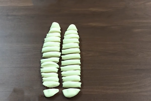 Bước 5: Dùng dao cắt nhỏ khối bột ra thành từng miếng nhỏ có kích cỡ vừa lòng bàn tay, dùng tay vê lại thành từng viên tròn.