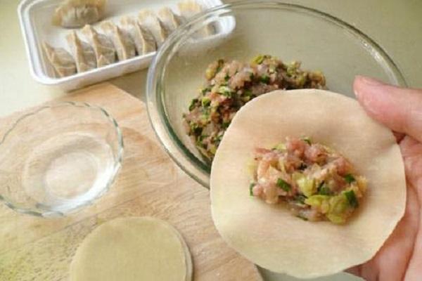 Bước 4: Tắt bếp, lấy từng chút nhân đặt vào giữa vỏ bánh sủi cảo để tiến hành làm bánh. Dùng tay nặn và gấp bánh lại cho kín và không bị vỡ. Thực hiện cho đến khi hết nhân.