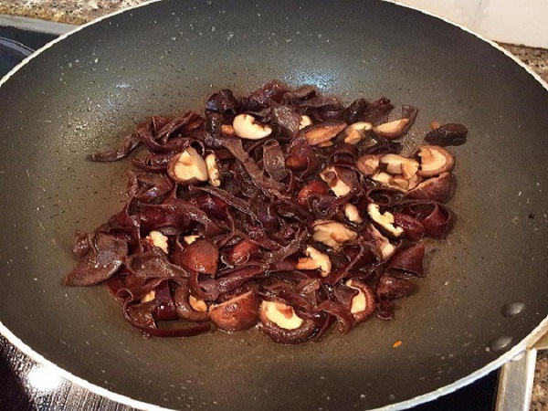 Bước 2: Mộc nhĩ, nấm hương ngâm nước nóng cho nở ra, sau đó vớt ra để thái nhỏ. Thực hiện tương tự với nấm rơm.