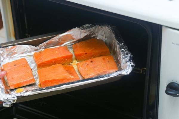 Cá hồi được ướp sẵn với công thức tùy thích rồi mới được cho vào lò nướng trong vòng 10 – 20 phút (tùy bạn thích ăn kỹ hay tái). Nếu nướng lò, bạn nên ướp miếng cá hồi trước với một chút muối.