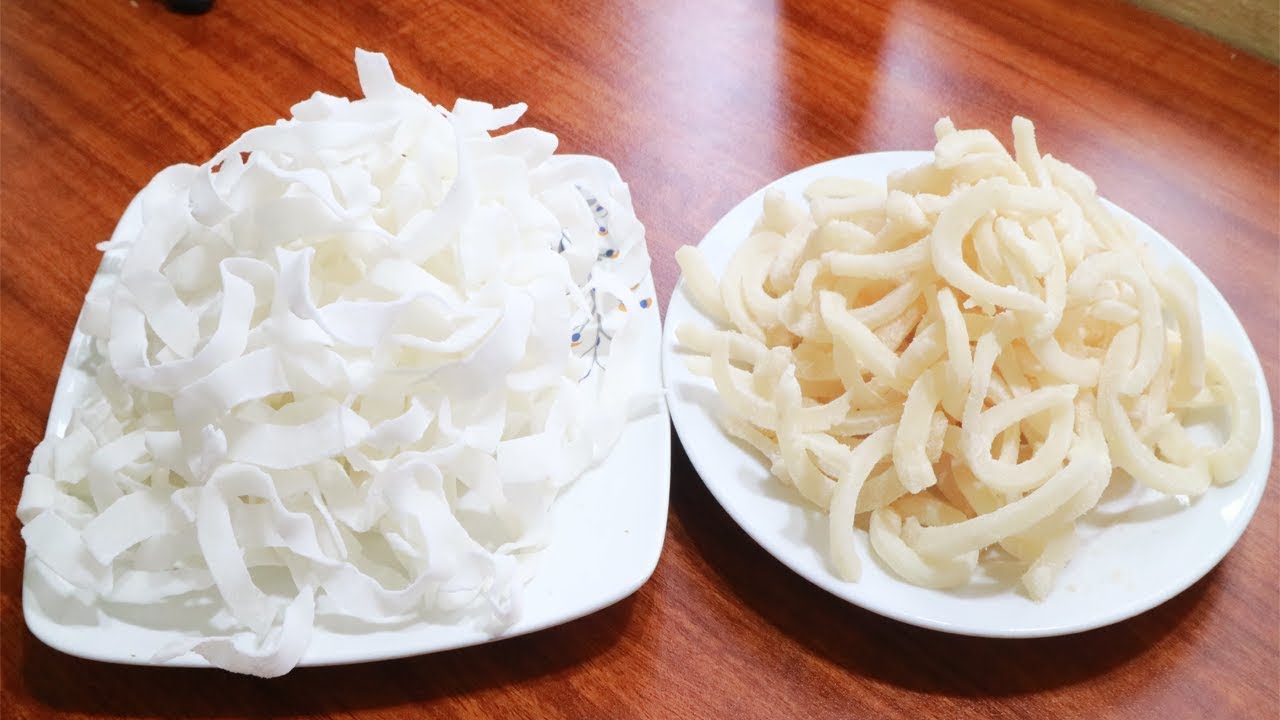 – Dừa sau khi mua về sẽ gọt sạch phần vỏ nâu, tiếp đến là dùng dao thái theo đường tròn của quả dừa để thu được những sợi dừa dài và mỏng theo đúng yêu cầu. Sau đó, rửa sạch phần dừa đã nạo cho đến khi nước ngâm không còn đục nữa.