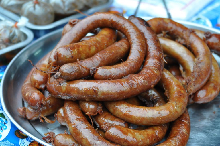 Sai Oua Kuang: Sai Oua Kuang là loại xúc xích thịt lợn nhồi cùng nhiều loại thảo dược thơm. Món này khi ăn sẽ được cắt nhỏ ra thành từng khoanh. Thực khách có thể chấm xúc xích với tương ớt Jeow đặc trưng của Lào, hoặc dùng luôn vì món ăn khá đậm vị. Ảnh: Theculturetrip.