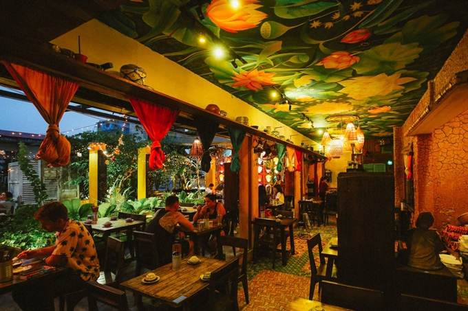Tuy nhiên, khi bước vào bên trong, bạn sẽ có cảm nhận khác. Quán có 2 khu, trong nhà và ngoài trời decor theo kiểu thôn quê Việt Nam, nền nhà lót gạch bông kiểu cũ, tường sơn vàng còn bàn ghế mộc mạc, mang lại cảm giác thân thuộc. Không có máy lạnh nhưng nhờ không gian mở nên quán khá thoáng ngay cả vào mùa hè.