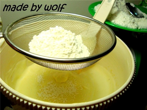 Khi hỗn hợp lòng trắng và lòng đỏ đã đều với nhau rồi chúng ta dùng rây, rây đều bột vào và tiếp tục trộn, cứ rây 1 ít rồi lại trộn và cứ tiếp tục như thế cho đến hết phần bột khô đả chuẩn bị. Chúng ta cứ liên tục vét thành thau rồi xoáy vào giữa, cứ như thế thì bột sẽ mau chóng trộn đều với nhau.