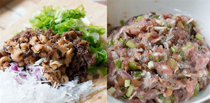 Bạn lấy miến ngâm vào một chén riêng cho mềm. Hành lá bạn rửa sạch băm nhỏ. Nấm tai mèo, nấm hương bạn cũng đem ngâm vào một chén khác, khi nấm nở bung ra, bạn đem rửa lại bằng nước sạch rồi cắt nhỏ.