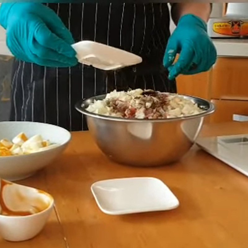 - Chia nhân thịt ra thành 20 phần, mỗi phần 65gr. Sau đó bạn miết dẹt nhân, cho 1 miếng trứng vào giữa rồi vo tròn.