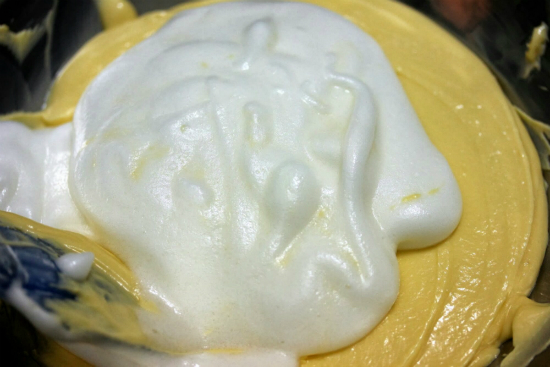 Bước 5: Chia hỗn hợp lòng trắng trứng thành 3 phần, cho lần lượt vào hỗn hợp lòng đỏ đánh đều tay cho đến khi hỗn hợp lỏng mịn, có màu vàng nhạt. Tránh trộn quá lâu bánh sẽ bị chai.