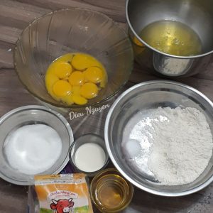 Cân đong nguyên liệu. Tách riêng lòng đỏ và trắng. Ray bột qua rây cho mịn. Lót giấy nến vào khuôn. Làm nóng lò ở nhiệt độ 150 độ C trước 15 phút.