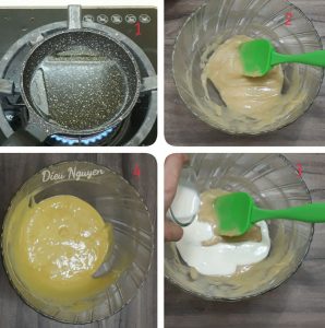 Dầu ăn cho vào nồi bắt lên bếp nấu 3-5 phút đến khi nóng (1). Cho dầu nóng vào bát thêm bột mì vào trộn nhanh tay đến khi hỗn hợp được đều (2). Cho tiếp sữa tươi và lòng đỏ trứng vào trộn nhanh ta cho hỗn hợp thật nhuyễn mịn. (3,4)
