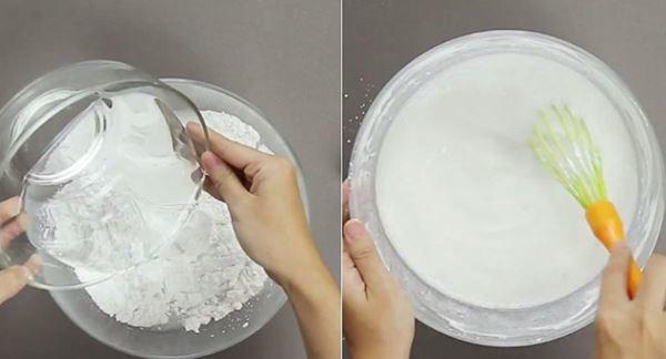 – Pha 1,2 lít nước cùng 400g bột gạo và 100g bột năng trong nồi lớn, khuấy tan bột, không được để bột vón cục. Thêm 2 thìa cà phê muối và 2 thìa canh dầu ăn. Cho bột nghỉ khoảng 1 giờ, bảo quản trong tủ lạnh.