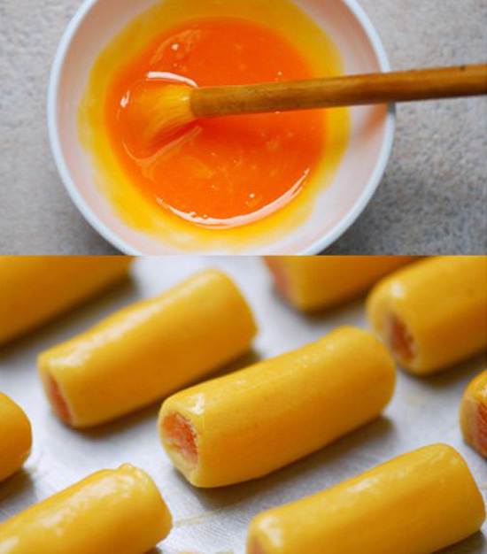 – Trộn đều hỗn hợp phết mặt bánh, dùng chổi mềm quét quanh từng đoạn bánh để tạo thành một lớp vỏ ngoài vàng đều.