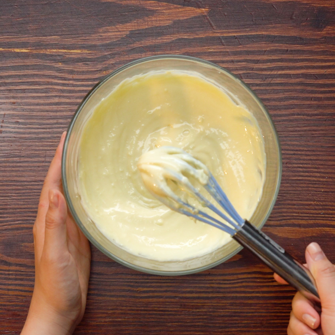Bạn đánh tan 4 miếng phô mai, thêm 2 muỗng canh sữa đặc, 1 ít muối, 2 muỗng canh mayonnaise, bạn dùng phới đánh cho đến khi hỗn hợp đều và mịn. Bạn cho hỗn hợp vào túi bắt kem và cho vào ngăn mát tủ lạnh 30 phút.