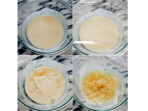 • Bọc nilon lên tô, cho vào lò vi sóng để trong khoảng 2 phút. Lấy ra dùng thìa trộn đều. Cho vào lò vi sóng thêm 2 phút nữa cho thành bột nhão. Lấy ra khuấy đều rồi lại cho vào lò vi sóng thêm 1 phút đến khi bột trở trong, nếm thấy bột đã chín là được.