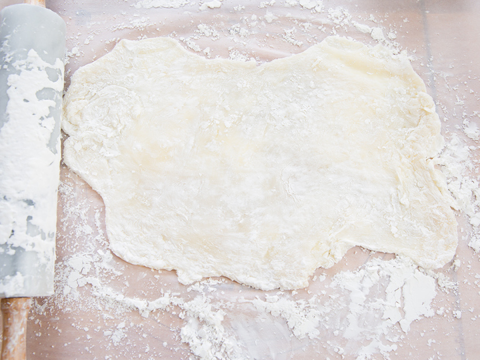 • Trải giấy nến lê bàn, rắc ít bột ngô chống dính lên, cho khối bột nếp vừa nấu lên trên, trải thêm 1 lớp giấy nến lên rồi dùng cán lăn miếng bột càng mỏng càng tốt. Sau đó cho bột vào tủ lạnh để trong 15 phút hoặc để ở nhiệt độ phòng cho nguội hẳn. Lưu ý, không để quá lâu sẽ làm bột khô cứng.