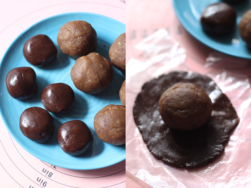– Cán mỏng phần vỏ bánh đã chuẩn bị, đặt viên nhân vào giữa, lấy phần vỏ bọc kín nhân lại.