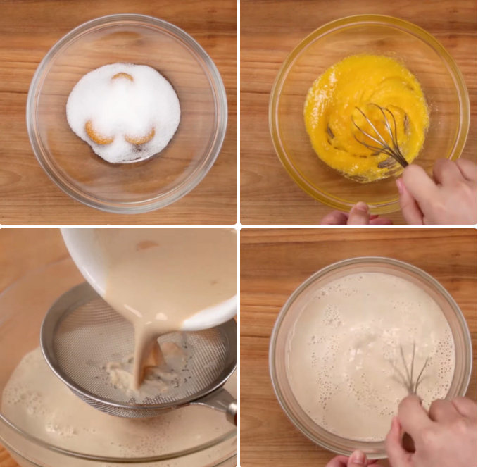 Cho 3 lòng đỏ trứng gà và 60gr đường vào 1 cái tô, bạn đánh đều tay để đường tan. Sau đó, bạn dùng rây để lọc trà sữa cho vào tô và trộn đều.