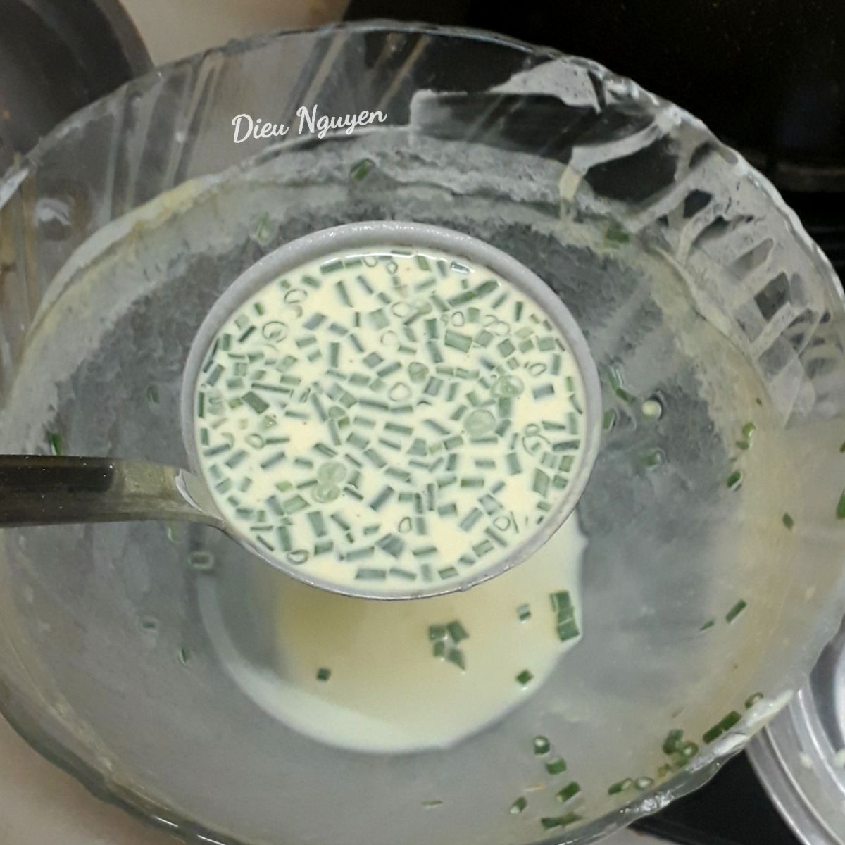 Cho tất cả nguyên liệu như: bột gạo, muối, bột nghệ, trứng, nước lọc, nước cốt dừa trộn đều, sau đó rây hỗn hợp cho thật mịn. Thêm hành lá cắt nhỏ vào để bột nghỉ 30 phút.