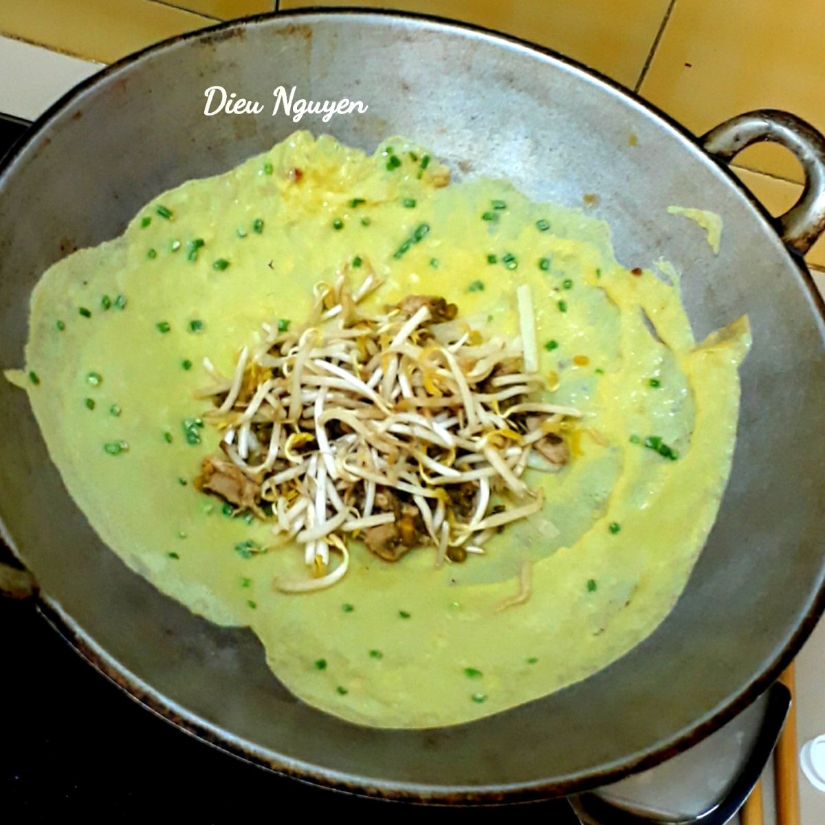- Thêm nhân vào bánh theo thứ tự như củ sắn, đậu, thịt, và cuối cùng là giá. Đậy nắp lại 2 phút dùng muỗng múc 1 ít dầu ăn tráng đều thành bánh cho vỏ được giòn hơn.