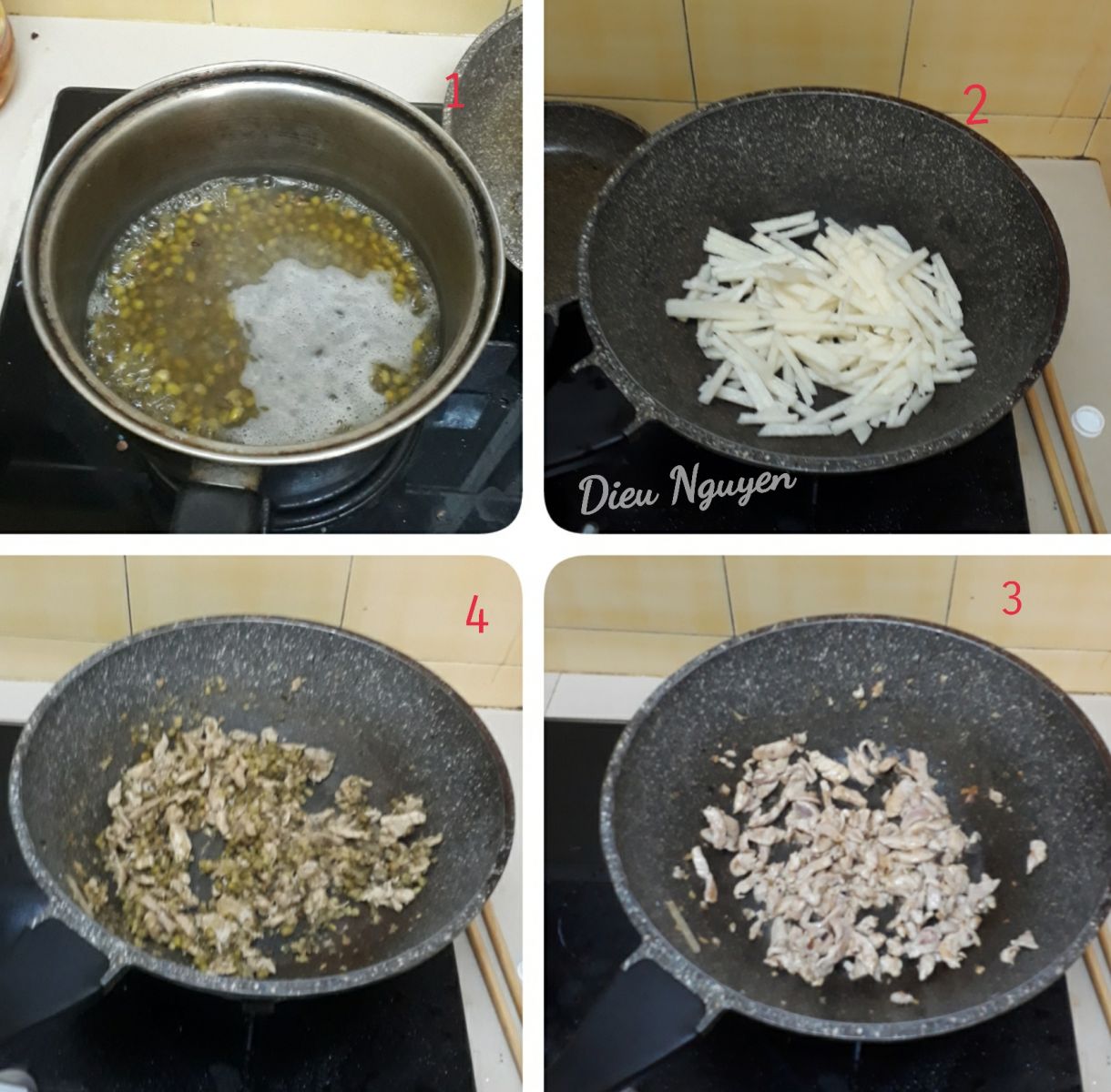 - Luộc đậu xanh cho chín, đổ đậu ra rổ cho ráo nước. Củ sắn (củ đậu) gọt vỏ cắt mỏng rồi lại cắt dài. Thịt cắt mỏng dài.