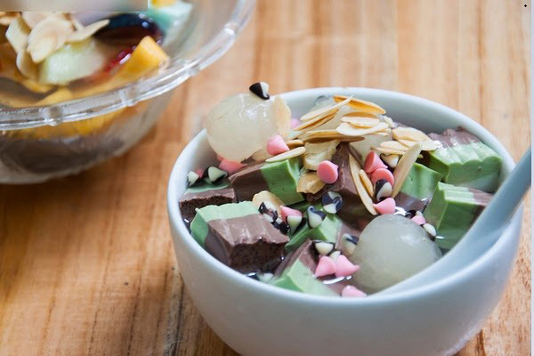 – Bước 9: Cho thạch, vải, dâu tây, hạt chia, hạnh nhân vào bát, chan nước đường vào, sau đó thêm đá là có thể thưởng thức được rồi.