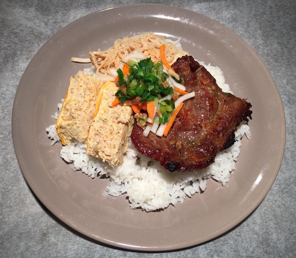 Tất cả đã sẵn sàng chỉ cần xới cơm vào dĩa, đặt miếng sườn lên, trét chút mỡ hành, tí đồ chua cùng vài lát cà chua, dưa leo xắt mỏng và chả trứng. Dọn ra cùng chén nước mắm sóng sánh tỏi ớt đỏ au là cả nhà có món cơm tấm sườn nướng khá tuyệt vời.
