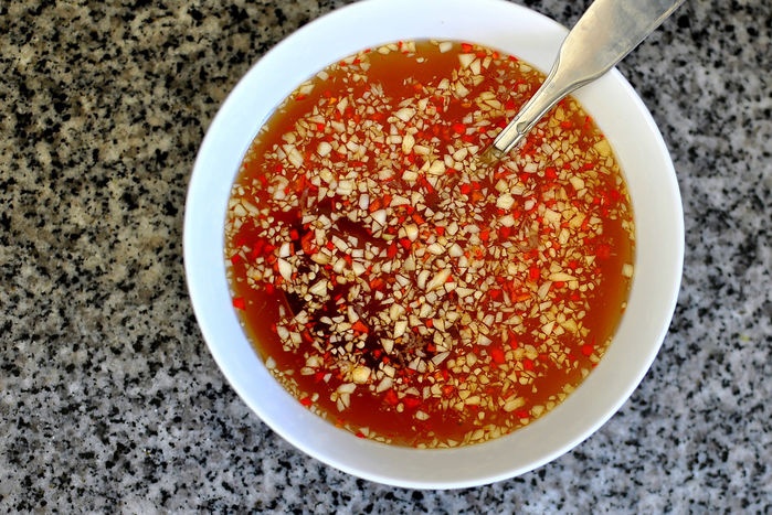 – Pha chế nước mắm: Chuẩn bị nửa chén nước sạch, cho thêm 2 muỗng canh đường, 2 muỗng nước mắm, khuấy đều cho đường tan. Sau đó cho tỏi, ớt băm vào trộn đều. Một lưu ý nhỏ đó là tỏi và ớt bạn nên cho sau thì nó mới nổi lên trên bề mặt chén mắm.