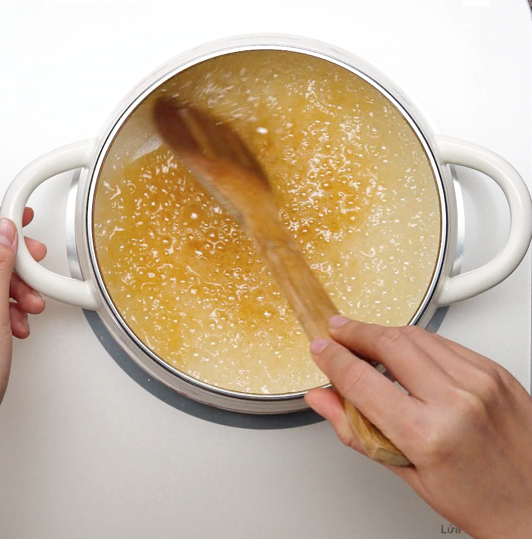 – Giờ chúng ta sẽ đun nước đường để ngâm đào. Các bạn chú ý đun ở lửa nhỏ và đun sôi khoảng 15′ đến khi nước đường hơi cô lại là được. Tỷ lệ là 1 đường : 2 nước.