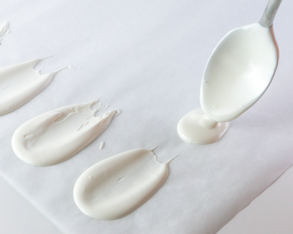 – Sau khi socola đã chảy hết, lấy một thìa đầy socola chảy, rót xuống một góc của tờ giấy nến. Dùng đầu thìa vuốt từ đầu đến cuối cánh hoa để tạo vết hõm cho cánh. Làm đi làm lại với nhiều cánh hoa khác nhau.