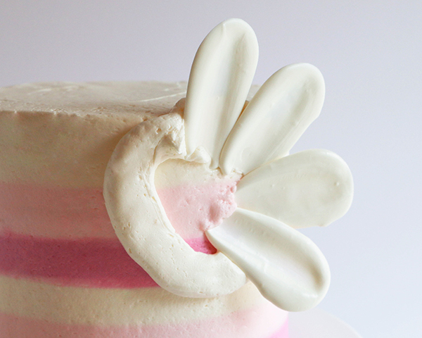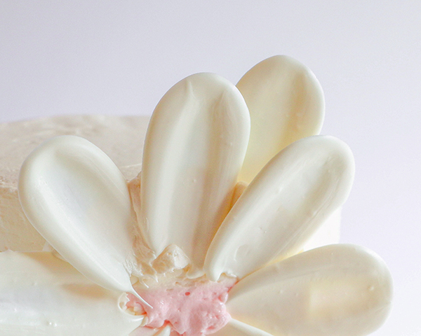 – Di chuyển một cánh hoa đã cứng trên tờ giấy nến, gắn vào đường tròn butter cream, tiếp tục là như thế với những cánh hoa khác cho đến khi kín vòng tròn.