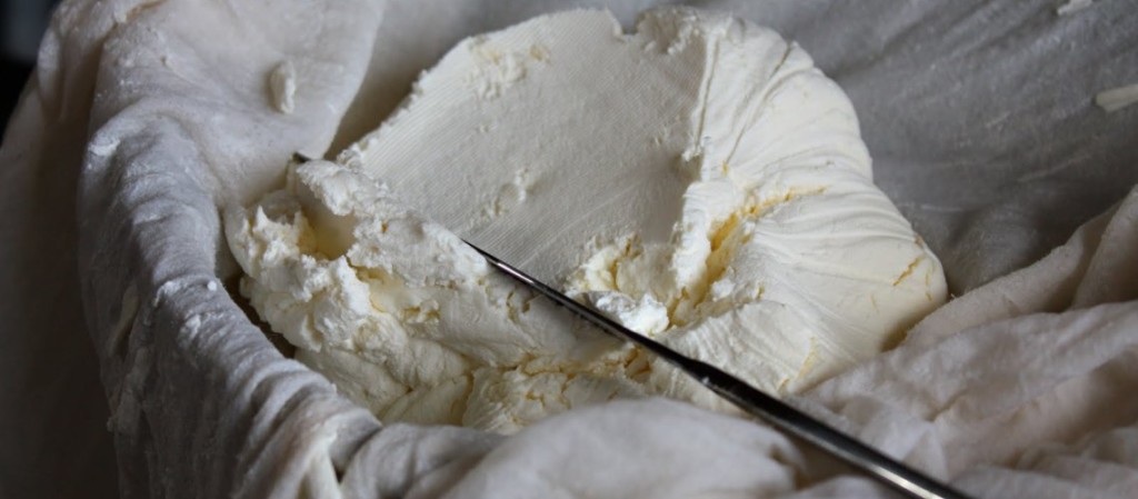(5) Trải khăn sạch lên rây lọc to, đổ hỗn hợp kem phô mai vào lọc. Vắt cho nước chảy hết (bạn có thể thu lại phần nước này để pha đồ uống, sẽ rất ngon và thơm), phần còn lại trong mảnh vải chính là cream cheese.