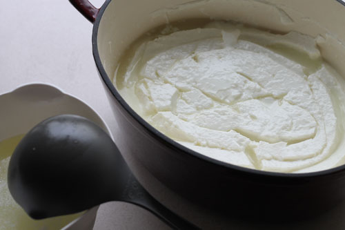 (4) Sau khi kem phô mai đã ủ đạt, đưa lên bếp đun ở lửa trung bình đến khi sôi, hỗn hợp tách nước.