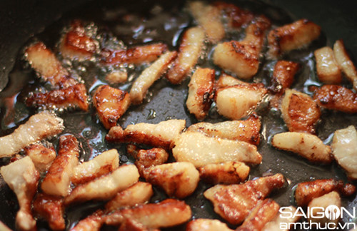 – Thịt ba chỉ các bạn chọn loại ít mỡ sẽ đỡ ngầy hơn. Thịt lọc bỏ da, thái nhỏ, cho lên chảo bật lửa nhỏ, vừa đun vừa đảo đều cho ra mỡ. Khi thịt chuyển thành màu vàng cánh gián các bạn vớt thịt ra bát.