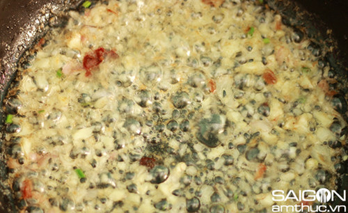 – Cho 2 muỗng hành tỏi băm vào chảo mỡ phi thơm vàng sau đó trút tôm vào đảo sơ