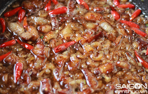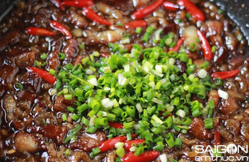 – Nếu bạn có nồi đất thì cho hết vào nồi đất và đun với lửa nhỏ cho đến khi nước sốt keo đặc lại và chuyển thành màu cánh gián thì tắt bếp, cho hành lá cắt nhỏ và 1 muỗng cà phê tiêu vào.