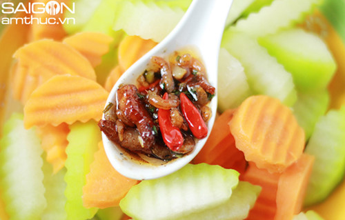 – Pha hỗn hợp gồm: 6 muỗng nước mắm; 4 muỗng đường; 4 muỗng nước lọc, khuấy đều.
