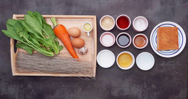– Cà rốt gọt vỏ, rửa sạch, thái sợi nhỏ. Ớt chuông xanh, đỏ thái sợi. Cải bó xôi nhặt gốc, rửa sạch, cắt khúc dài 3 – 4cm. Bạn chần sơ các loại rau củ này với nước sôi, vớt ra cho vào nước lạnh để giữ độ giòn. Tiếp đó, đem ướp với dầu mè, đường, muối.