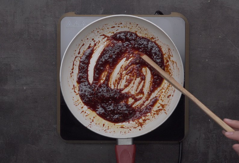 Cho chảo lên bếp, đợi nóng cho 2 muỗng cà phê dầu ăn, 1/2 muỗng cà phê tỏi phi thơm. Khi tỏi thơm thêm 4 muỗng canh nước tương, 2 muỗng canh đường, 1 muỗng cà phê giấm, 2 muỗng canh đường bắp, 4 muỗng canh ớt bột, đảo đều xào đặc lại sau đó tắt bếp để nguội.