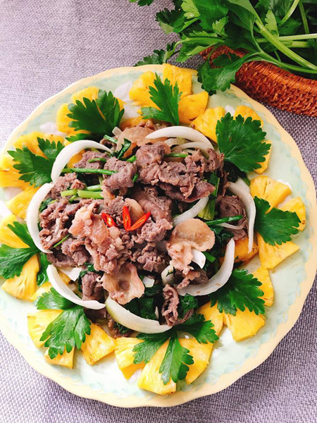 – Cho ít dầu vào chảo, dầu nóng cho hành tỏi băm vào phi thơm, cho thịt bò vào xào với lửa lớn, thịt săn cho dứa vào xào cùng nêm gia vị lại cho vừa ăn. Thịt và dứa chín thì cho hành tây vào xào cùng, thêm hành cần rồi tắt bếp, rắc tiêu xay.