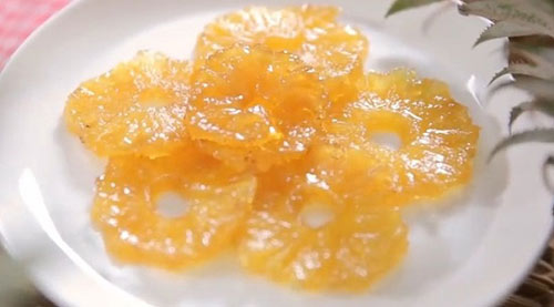 – Sên mứt dứa ở lửa nhỏ cho đến khi miếng dứa trong, thêm nước cốt chanh vào tiếp tục sên đến khi dứa ăn có vị dẻo, chua ngọt thì tắt bếp.