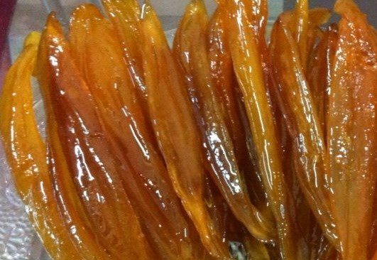 – Bước 5: Cuối cùng bạn cho tất cả phần mứt vừa sên xong vào khay khay có lót giấy nến, dàn đều rồi đem phơi nắng khoảng 2 tiếng cho mứt khô dẻo là được.