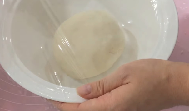 Bước 2: Sau khi bột nghỉ 15 phút thì lấy bột ra nhào. Nhào liên tục cho đến khi thấy bột thành một khối dẻo mịn, không bị dính tay là được. Cho bột lại vào âu, dùng màng bọc thực phẩm ủ bột khoảng 1 tiếng. Khi thấy bột nở gấp đôi thì lấy ra.