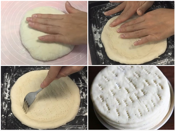 Bước 3: Khi bột đã nở gấp đôi, lấy ra nhào lại 1 lần rồi chia bột thành 3 phần (công thức này cho ra 3 đế bánh). Vo tròn bột lại, dùng tay ấn dẹt cục bột xuống rồi miết cho đến khi bột thành hình tròn, có độ dày theo ý thích là được. Dùng nĩa (dĩa) ấn vài đường vào bánh rồi cuộn bánh tạo viền bánh, đặt bánh vào khay nướng.