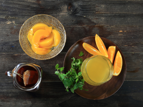 - Cam 1 quả cắt múi cau. 1 quả vắt lấy nước cốt. Với đào, bạn có thể dùng đào đóng hộp hoặc tự làm đào ngâm nước đường tại nhà theo công thức trên Học Viện Ẩm Thực đều được.